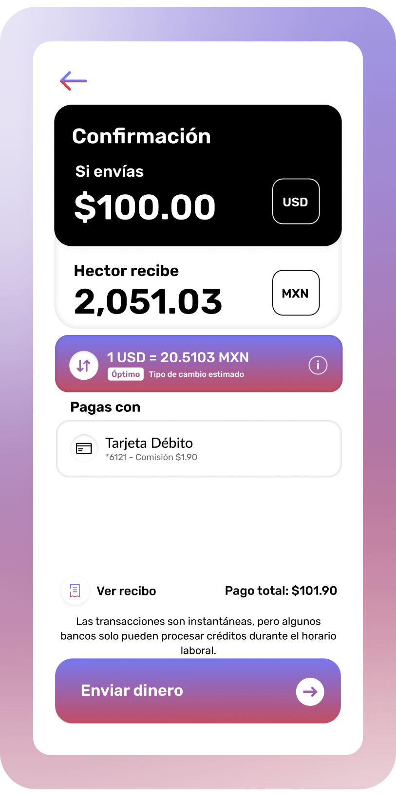 Por ejemplo, los pagos con tarjeta de débito tienen tarifas más bajas que los pagos en efectivo. En todos los casos, cotizaremos tu transferencia y te mostraremos el costo total de la remesa (TCR). Nos esforzamos por mantener los costos más bajos posibles para tu beneficio.